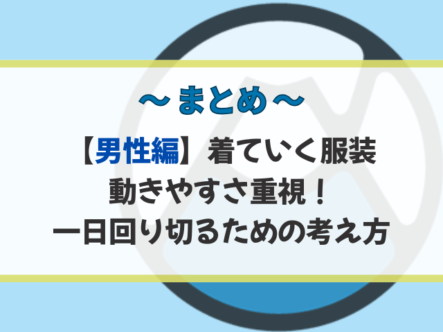 「体力はあるつもりだけど、服装ミスでテンションが下がるのは避けたい」という20代男性向けに、一日中動きやすい服装の考え方をまとめています。